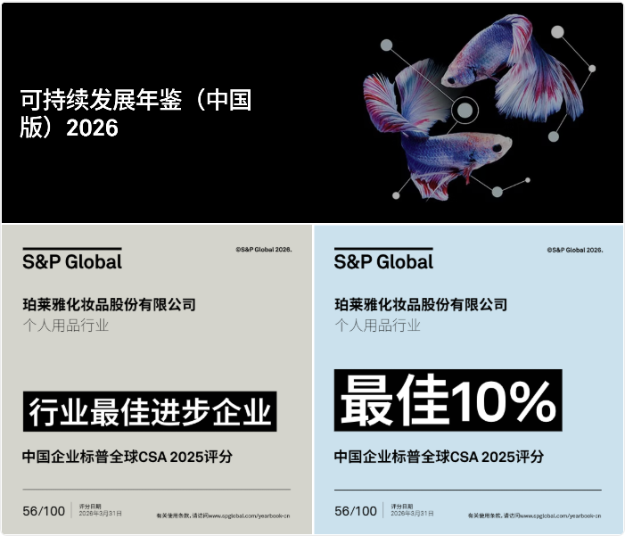 Recently, Proya Cosmetics Co., Ltd. (hereinafter referred to as Proya Cosmetics) was selected for S&P Global Sustainability Yearbook (China Edition) 2026, ranking in the top 10% of the personal care industry and being named the Best Progress Enterprise in the industry (with only one enterprise awarded per industry). Proya Cosmetics' selection not only marks the first time a Chinese beauty enterprise has received this honor, but also makes it the only Chinese cosmetics company shortlisted in this evaluation.