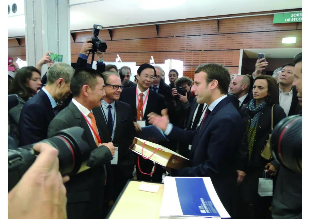 侯军呈向时任法国经济部部长马克龙介绍珀莱雅股份及中国美妆产业发展情况